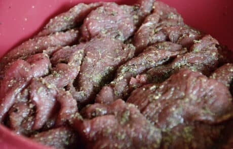 Mit den trockenen Gewürzen und Aromaten wird im Handumdrehen eine aromatische Trockenmarinade, ein sogenannter “Rub”, gemischt. Der wird über das Fleisch gestreut und ordentlich einmassiert, bis wirklich jede Scheibe gut gewürzt ist. In einer verschließbaren Schüssel ruht das Fleisch dann erstmal 6-8 Stunden im Kühlschrank. Erst danach werden Soja- und Worcestershiresauce zugegeben, woraufhin die Fleischscheiben nochmal 18-36 Stunden marinieren dürfen.