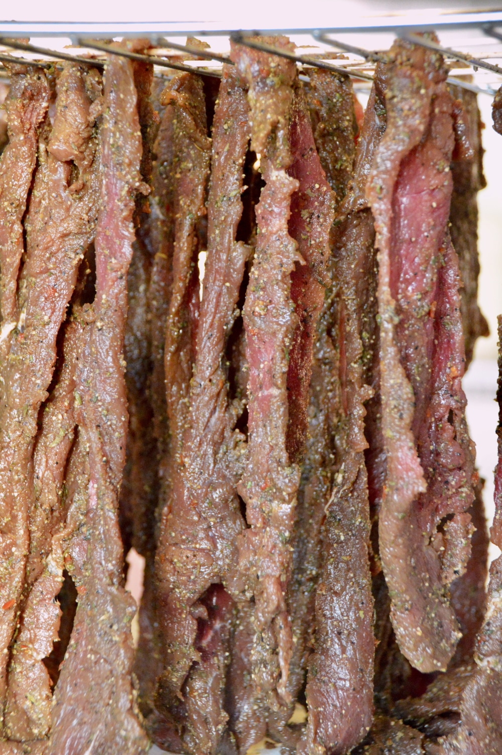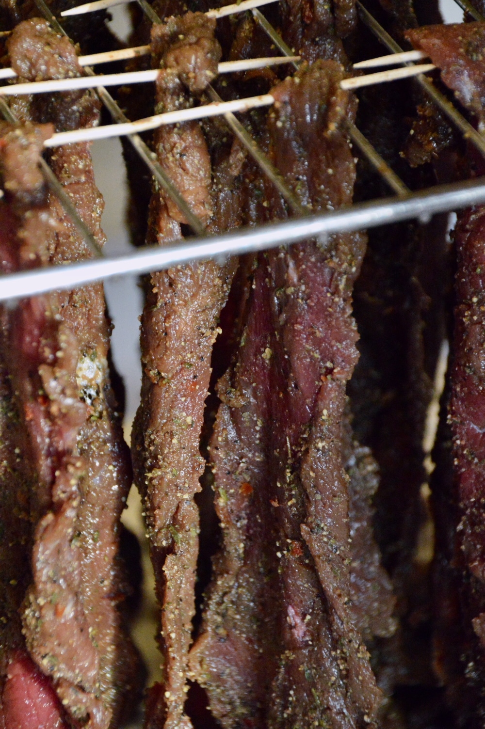 Bei der Technik zum Aufhängen gibt es viele Mittel und Wege, im Ofen spieße ich die Fleischscheiben immer am Ende mit einem Zahnstocher durch und hänge diesen in den Rost. Auf dem Smoker lege ich das Fleisch auf mehrere Roste, bei kleinen Jerky-Mengen geht das auch im Ofen mit Blechen. Erlaubt ist, was irgendwie zum Ziel führt.