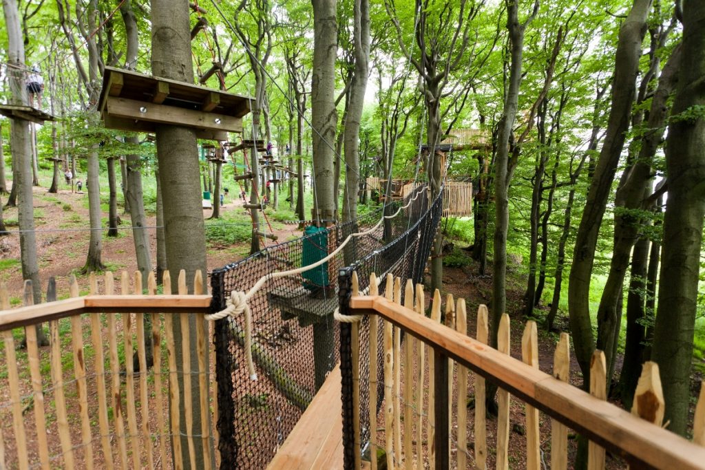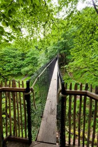 Seit dem Jahr 2012 kann man am Hoherodskopf im Vogelsbergkreis einen Baumkronenpfad besuchen, der einmalig in seiner Art ist. Nur außerhalb von Europa, z.B. in Malaysia, konnte man bisher einen Baumkronenpfad mit einer „schwebenden“ Brückenkonstruktion besuchen. Was im Nationalpark in Ghana mit dem Canopy Walk als legendär und einzigartig gilt, hat der Naturpark Hoher Vogelsberg jetzt auf den Hoherodskopf in den Vogelsbergkreis geholt: Mit festen Tauen gesicherte Holzplanken sind von Baumkrone zu Baumkrone gespannt und ermöglichen es den Besuchern, etwa 15 Meter über dem Erdboden zu laufen. Frei wie die Vögel des Waldes bewegen sich die Besucher auf dem insgesamt 500 m langen Baumkronenpfad über Hängebrücken. Ein aufregender Spaziergang zwischen den Baumwipfeln, bei dem man sich einmal wie die Waldindianer am Amazonas fühlen und den Vögeln in den Baumkronen „Guten Tag“ sagen kann.