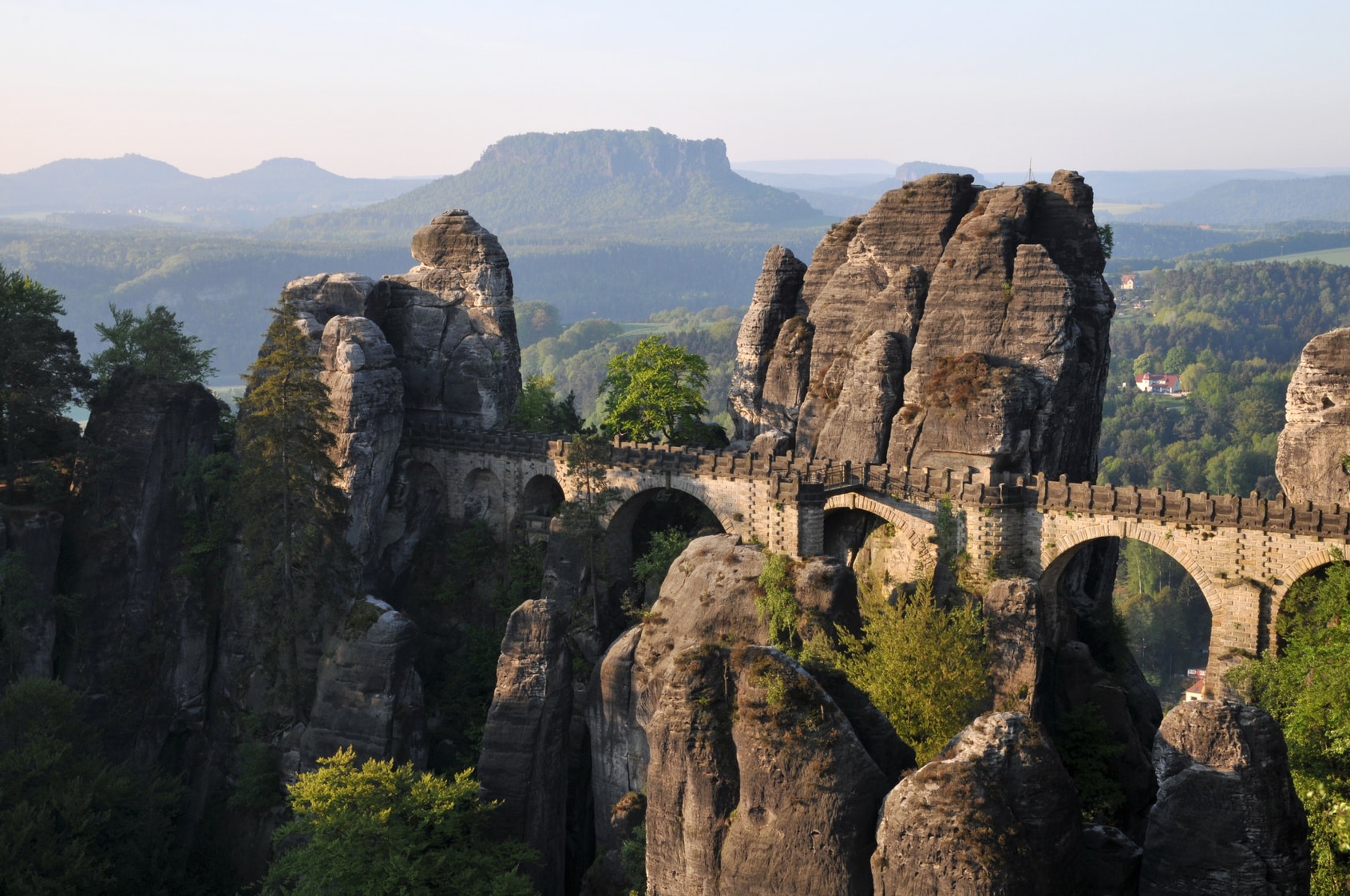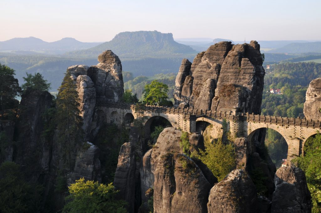 Die Bastei ist die berühmteste Felsformation der Sächsischen Schweiz und bietet eine atemberaubende Aussicht auf viele bekannte Sehenswürdigkeiten der Region. Die Basteibrücke ist das Wahrzeichen der Bastei, eine sandsteinerne Brücke von 76,5 Metern Länge, die eine 40 m tiefe Schlucht überspannt. Über die Brücke gelangt man zur bekannten Ruine der Felsenburg Neurathen, die größte mittelalterliche Felsenburg der Region. ℹ Buchtipp: Bruckmann Wanderführer: Panoramawege Elbsandsteingebirge