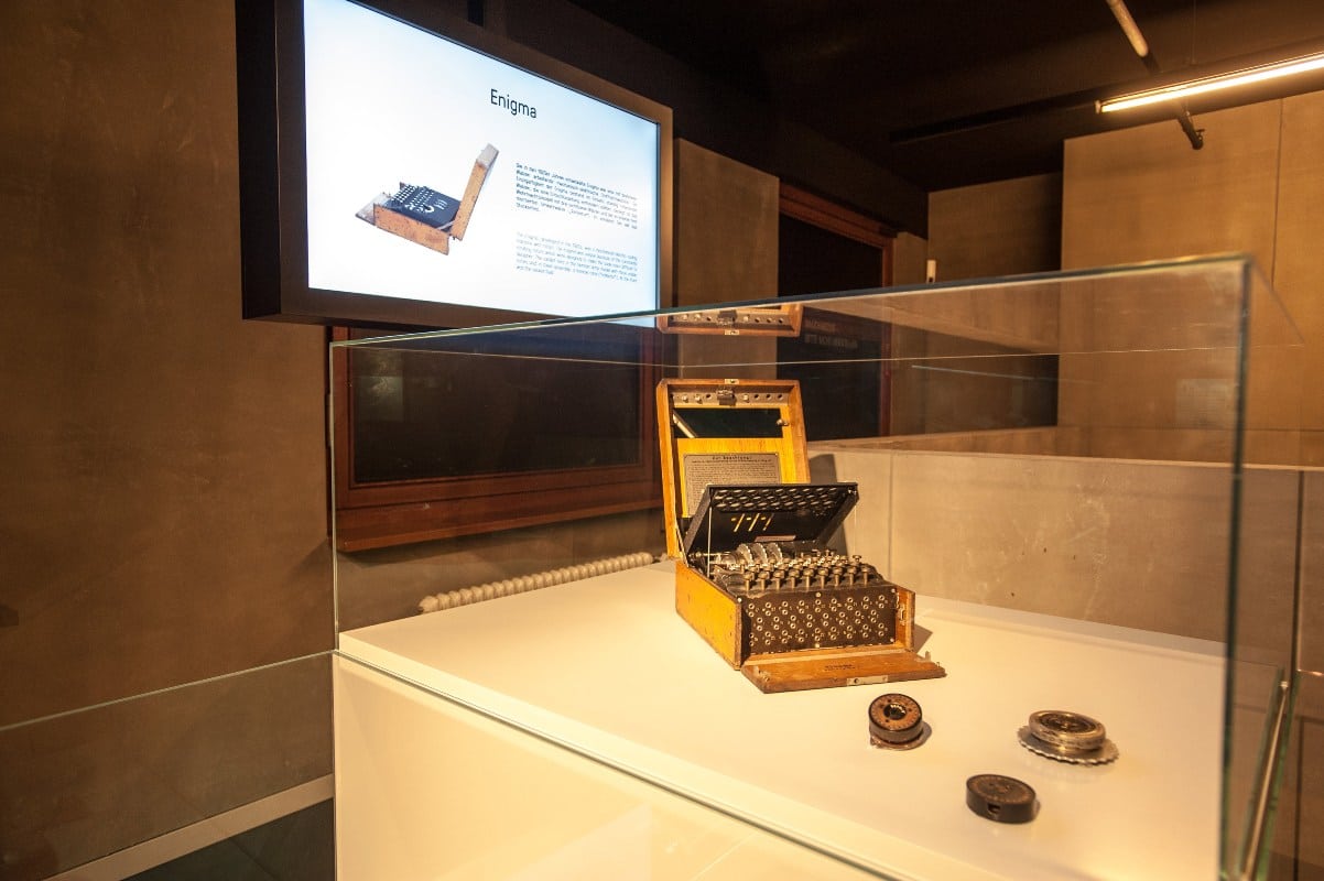 - Nachrichten codieren und decodieren: Der Besucher erlebt auf praktischer Ebene das Funktionsprinzip der Rotor-Chiffriermaschine Enigma und kommuniziert mit anderen Besuchern mittels verschlüsselter Nachrichten.