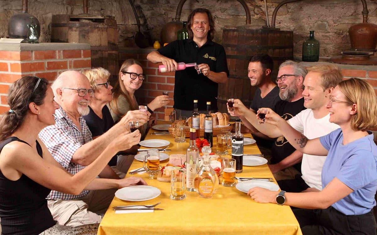 Höhepunkt ist eine Schnaps- und Likörverkostung im urigen Kellergewölbe. Die Gestaltung kann bürgerlich, lustig oder intellektuell erfolgen: Freuen Sie sich auf Trinksprüche, Anekdoten und interessante Erläuterungen.