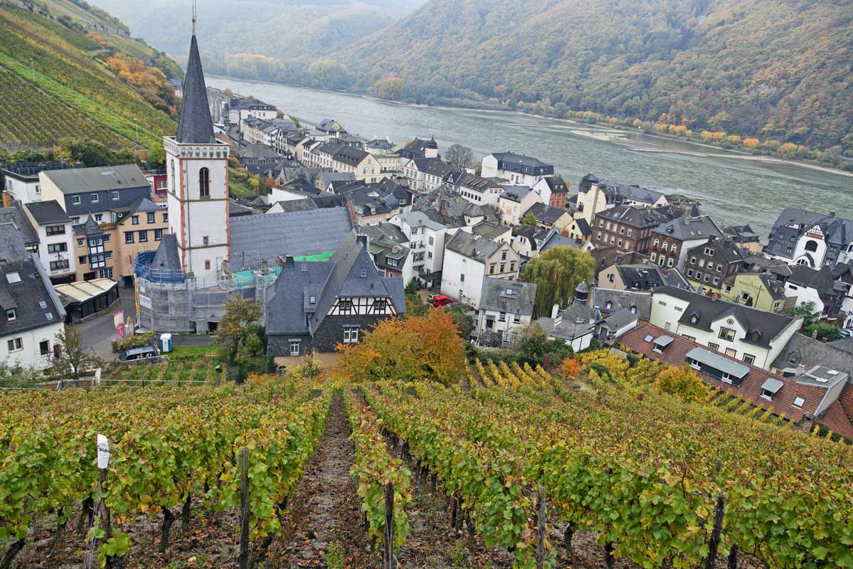 4. Etappe: Assmannshausen – Kaub (23 km): Die Schlussetappe des Rheingauer Rieslingpfads leitet den Wanderer hinüber vom hessischen Rheingau ins rheinland-pfälzische Loreley-Burgen-Land. Los geht es an der katholischen Pfarrkirche Heilig Kreuz in Assmannshausen, die im 14. Jahrhundert errichtet wurde. Weiter führt der Rieslingpfad hinauf zum Teufelskadrich (416m) oberhalb des Rheins mit schönen Aussichtspunkten. Über den Taleinschnitt Bächergrund erreicht man das idyllische Lorch mit der Pfarrkirche St. Martin, die den größten und ältesten nachgewiesenen Holzschnitzaltar besitzt. Unterhalb der Ruine Nollig geht es dann wieder hinauf in die Rheingau-Hänge. Der Rheingauer Rieslingpfad verläuft jetzt parallel zum Rhein nach Lorchhausen, den westlichsten und auch tiefsten Ort in Hessen. Hinter Lorchhausen wird die Grenze nach Rheinland-Pfalz überquert. Zwei beeindruckende Burgen begleiten das letzte Teilstück des Rieslingpfades: Burg Pfalzgrafenstein im Rhein und Burg Gutenfels oberhalb von Kaub. Der Rheingauer Rieslingpfad endet in Kaub am Blüchermuseum.