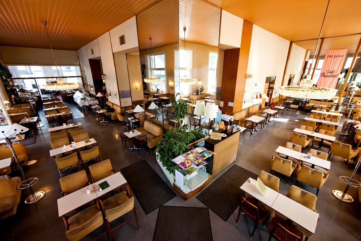 In einem besonders prunkvollen Gebäude gründete der frühere Radrenneuropameister Lurion, eine bekannte und schillernde Persönlichkeit seiner Zeit, das heutige Prückel. Nach dem Zweiten Weltkrieg ließ man den vorderen Teil des Cafés durch Oswald Haerdtl, einen der bedeutendsten Wiener Designer und Architekten der Fünfziger Jahre, neu gestalten, was bis heute erhalten geblieben ist. Café Prückel, Stubenring 24, 1010 Wien, Öffnungszeiten: täglich 8.30 – 22.00 Uhr. www.prueckel.at