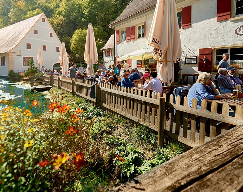 Anschließend bietet es sich an, im Gasthof Friedrichshöhle eine wohlverdiente Pause einzulegen. Mit dem Supererlebnis im Gepäck macht es Spaß, sich bei liebevoller Esskultur auszutauschen. In der Küche des Gasthofs werden nur Bio-Lebensmittel (einschließlich Bio-Getränke) und Fischspezialitäten aus der Zwieflalter Ach angeboten. Plus: Die Terrasse liegt direkt und idyllisch am Flusslauf. Das Familienrestaurant ist barrierefrei und es existiert ein Wasserspielplatz.