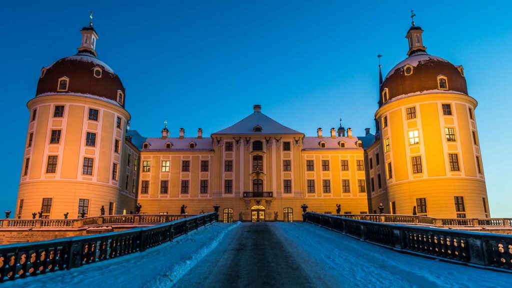 Das barocke Schloss Moritzburg nahe Dresden erhebt sich auf einer künstlichen Insel im Schlossteich und erhielt seine heutige Gestalt im 18. Jahrhundert unter August dem Starken. In den Jahren 1946–1949 erfolgte die Einrichtung eines Museums für Barock in einigen Räumen des Schlosses. Das Schloss war bereits mehrfach Kulisse für Märchenfilme.