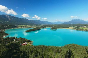 Der türkisblaue, 2,2 Quadratkilometer große und bis zu 30 Meter tiefe Faaker See ist der fünftgrößte See Kärntens und zählt zu den beliebtesten Badeseen Österreichs. Er liegt südlich von Villach und der Drau und erhält seine auffällige türkisblaue Farbe durch den Zufluss der Worounitza: sie führt dem See kleine Kalkpartikel zu, die das Sonnenlicht türkisblau reflektieren.