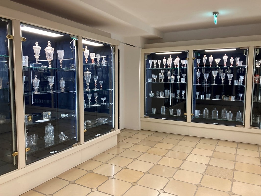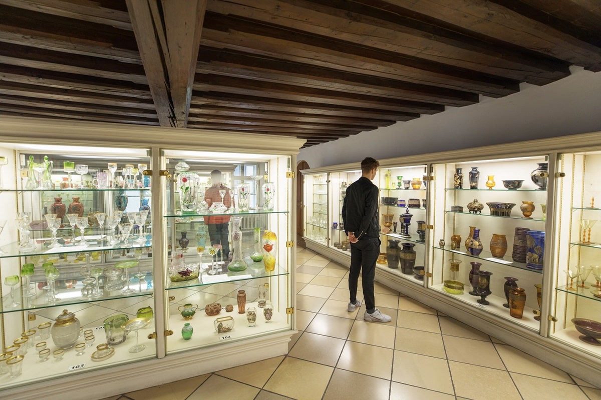 Auf vier Etagen mit insgesamt 36 Räumen können Besucherinnen und Besucher Glaskunst von 1650 bis ins Jahr 1950 bestaunen. Bayern, Böhmen, Österreich und Schlesien beherbergten im 19. Jahrhundert die großen Glaszentren, die marktbeherrschend waren und ganz Europa mit Gebrauchs- und Kunstglas versorgten. Die Glashütten suchten traditionell die Nähe zum Brennstoff Holz und konzentrierten sich deshalb in den waldreichen Mittelgebirgen nördlich und südlich von Prag. Die Ausstellung im Museum ist chronologisch aufgebaut und besteht aus Serienproduktionen und Einzelstücken; die Gläser sind raumweise nach Glashütten geordnet. Zu sehen sind Werke aus unterschiedlichen Stilrichtungen wie dem Barock, dem Empire- und Biedermeierstil, dem Klassizismus sowie aus dem Historismus, dem Jugendstil und schließlich im Stil des Art Deco und der Moderne.