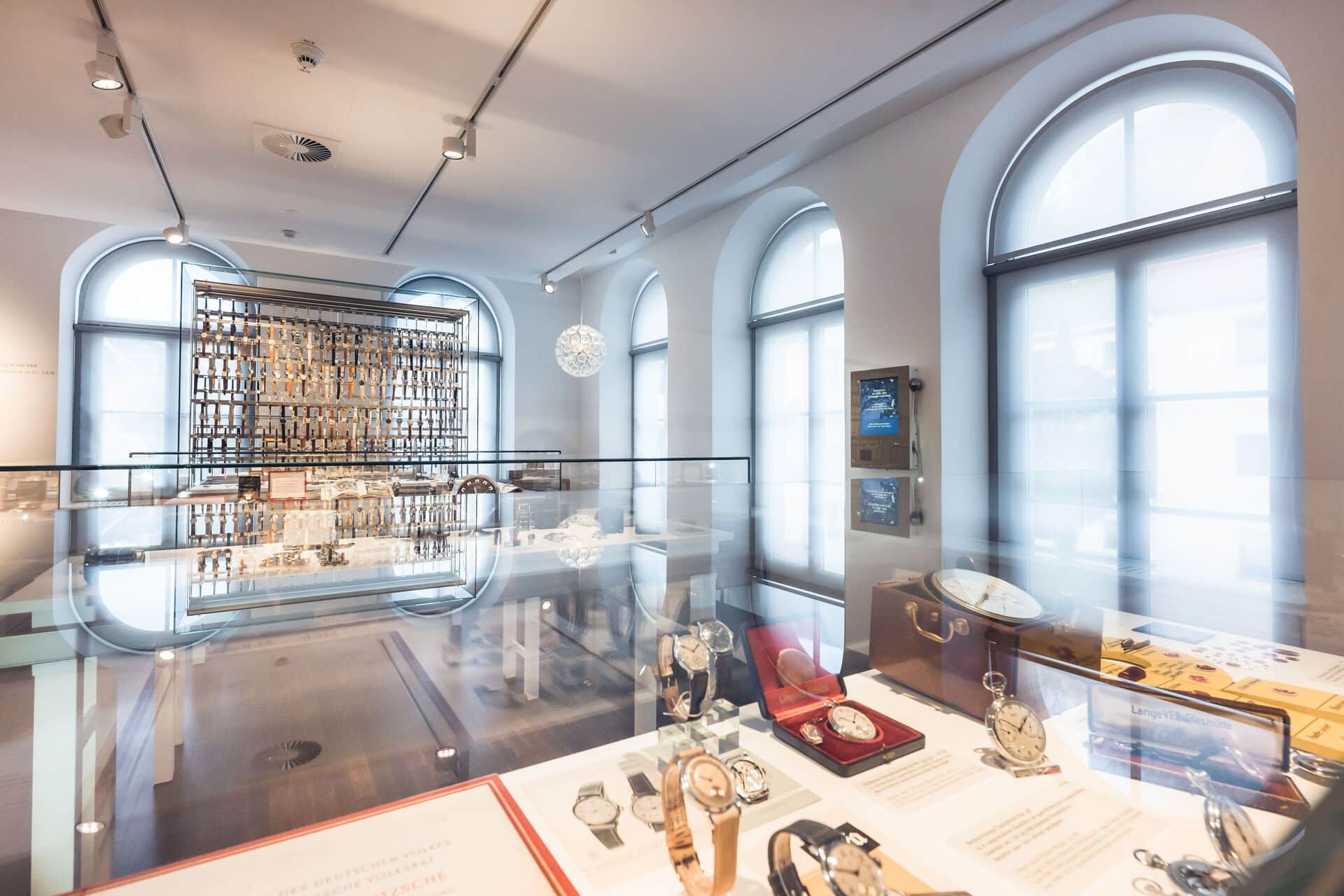 Auf insgesamt zwei Stockwerken und 1.000 qm Ausstellungsfläche werden in der Dauerausstellung mehr als 500 einmalige Exponate präsentiert und multimedial erlebbar gemacht: Glashütter Taschen-, Pendel- und Armbanduhren verschiedener Epochen, Marine-Chronometer, historische Urkunden, Werkzeuge sowie Fotografien werden kunstvoll in Szene gesetzt. Thematisch setzt sich die Ausstellung aus einer Reihe von „Historienräumen“, „Zeiträumen“ und einer Restaurierungswerkstatt zusammen, die von einem Prolog und einem Epilog eingerahmt werden.