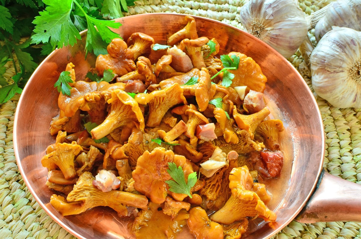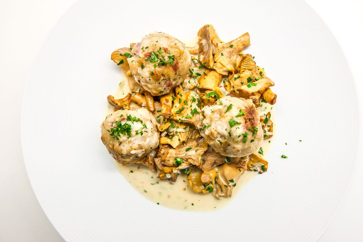 Zu den klassischen Gerichten gehört die Kombination von Pfifferlingen mit Semmelknödeln. Wer auf fleischlos setzt, der ist hier genau richtig. Die Knödel bereichern den Pilzgeschmack und umgekehrt. Die Menge der Sahne für die Sauce kann je nach Gusto hinzugefügt und dosiert werden.