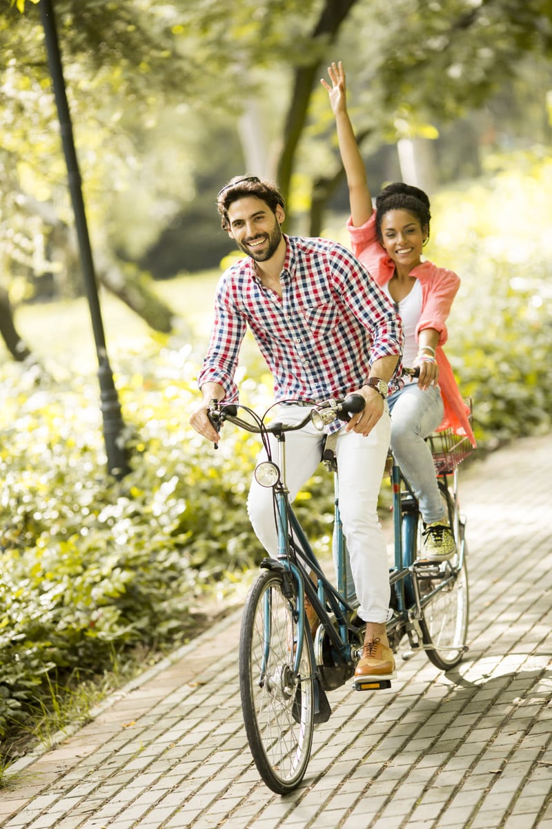 Der Frühling ist da – Zeit, einmal das Tandemfahren auszuprobieren! Das Tandem ist „das“ Fahrrad für Verliebte: Man kommt sich sehr nah, muss gegenseitiges Vertrauen an den Tag legen und erlebt unverwechselbar schöne Augenblicke – und das alles gemeinsam in der Natur. Wenn das nicht romantisch ist? Wer zu zweit auf das Fahrrad steigt, muss rücksichtsvoll sein und unbedingt miteinander kommunizieren. Der vorne Radelnde wird „Captain“ oder Pilot, der Hintermann beziehungsweise die Hinterfrau wird „Stoker“, zu deutsch „Heizer“, genannt. Der Captain trifft in der Regel Entscheidungen, wie etwa Hindernisse umfahren werden, wann gebremst wird und wie eine Kurve eingeleitet wird. Der Heizer ist, wie der Name schon sagt, für die Trittenergie zuständig. Richtungsänderungen und sonstige Manöver kündigt der Captain rechtzeitig verbal an. Tipp: Zum Üben sollte der Captain oder die Pilotin erst einmal ein paar Runden auf verkehrsarmen Wegen alleine drehen.