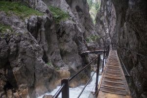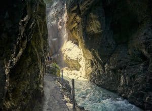 Die Höllentalklamm liegt bei Grainau am Fuße der Zugspitze im Wettersteingebirge und ermöglicht einen fantastischen Einblick in die Gewalten der Natur: Schluchten von bis zu 150 Meter Tiefe, zahllose Wasserfälle, riesige Fels- und Eisbrocken sowie verschlungene Wege, Stege, Brücken und Tunnel kann man hier erleben.