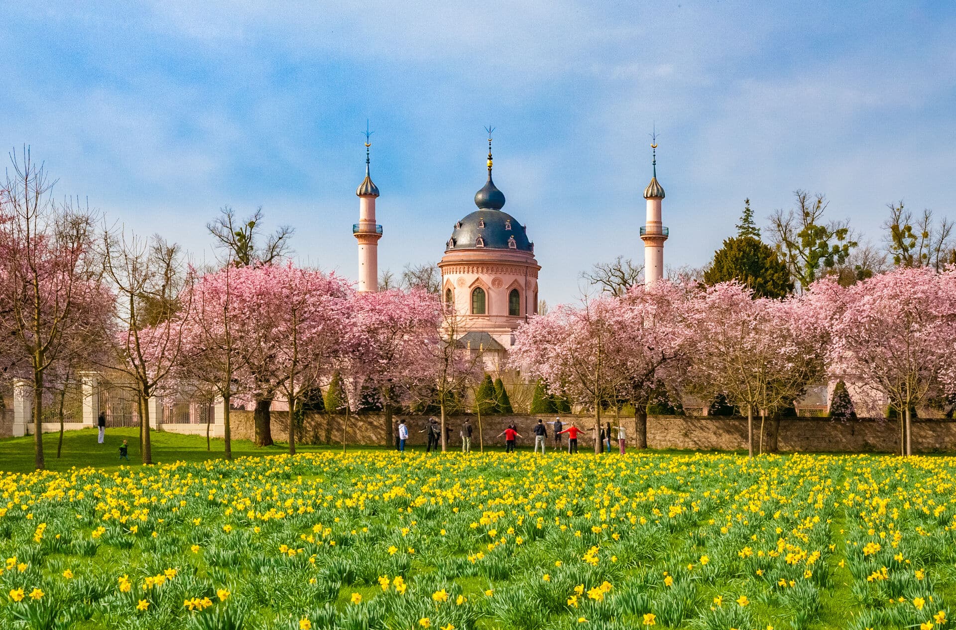 Das Schloss Schwetzingen geht bis ins 14. Jahrhundert zurück und entstand in seiner Pracht im 18. Jahrhundert – die Visionen des Kurfürsten Carl Theodor von der Pfalz ließen einen bezaubernd schönen Schlossgarten entstehen, der heute zu den Meisterwerken europäischer Gartenkunst zählt. Eine besondere Attraktion im Frühling ist die Blüte der Japanischen Zierkirschen im Garten vor der Schwetzinger Moschee. In den ersten wärmeren Frühlingstagen beginnen die Bäume üppig zu blühen und hüllen den Schlossgarten in ein weißes und rosafarbenes Blütenmeer.
