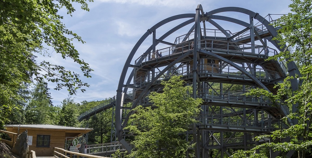 Der Baumwipfelpfad Schwarzwald bei Bad Wildbad zeigt auf einer Länge von 1,2 km eines der bekanntesten deutschen Mittelgebirge aus einer neuen Perspektive. Der Aussichtsturm in einer Höhe von 40 Meter bietet einen spektakulären 360-Grad-Blick über die endlosen Wälder und beeindruckenden Täler des Schwarzwalds. Kletter- und Balancierstationen machen den Weg zum Turm zu einem Abenteuer, und für Mutige gibt es ganz zum Schluss noch ein besonderes Highlight: Die 55 Meter lange Tunnelrutsche führt von der Plattform nach unten zum Ausgang.