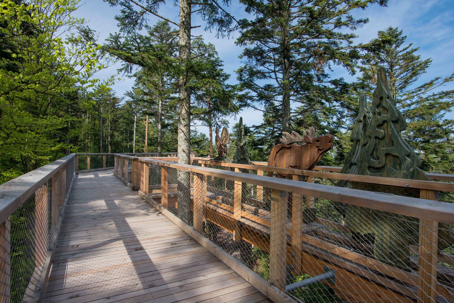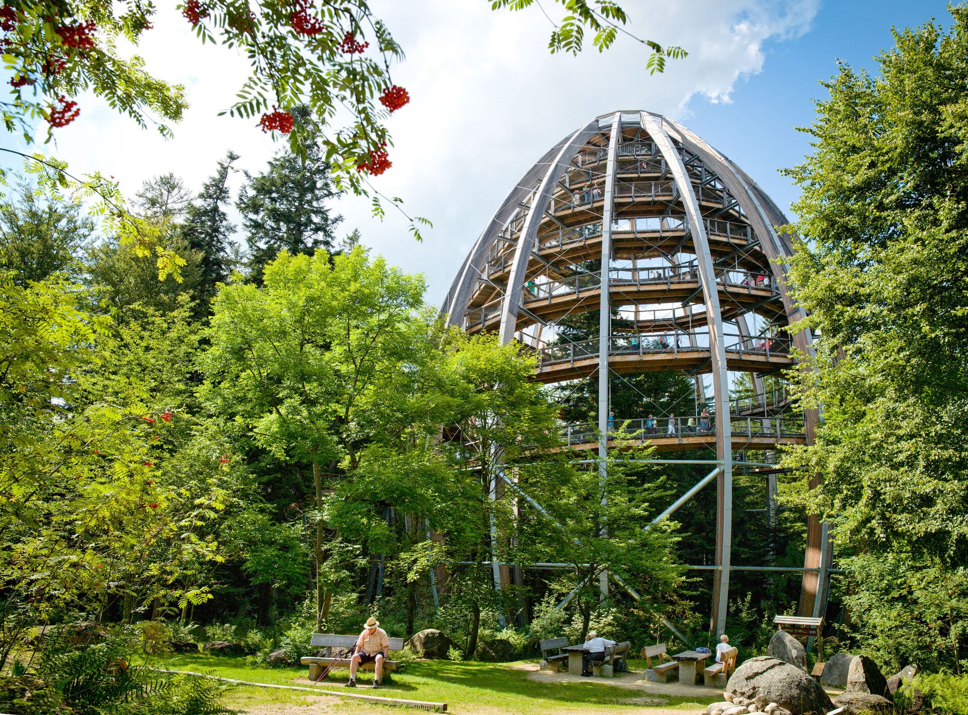 Auf einer Länge von ca. 1,3 km führt der Baumwipfelpfad im Bayerischen Wald in ungeahnte Höhen und bietet schöne Ausblicke über die Kulturlandschaft der Region. Höhepunkt ist der 44 Meter hohe Baumturm, der im Inneren drei uralte Tannen und Buchen birgt. Auf der Plattform des Baumturmes hat man einen tollen Fernblick: An sonnigen, klaren Tagen ist sogar der nördliche Alpenhauptkamm zu sehen. Auf dem Weg gibt es zahlreiche Erlebniselemente wie Seilbrücken, Wackelbrücken und Balancierbalken zum Ausprobieren. Für Neugierige stehen außerdem sieben Infotafeln rund um das Thema Wald am Wegesrand bereit.