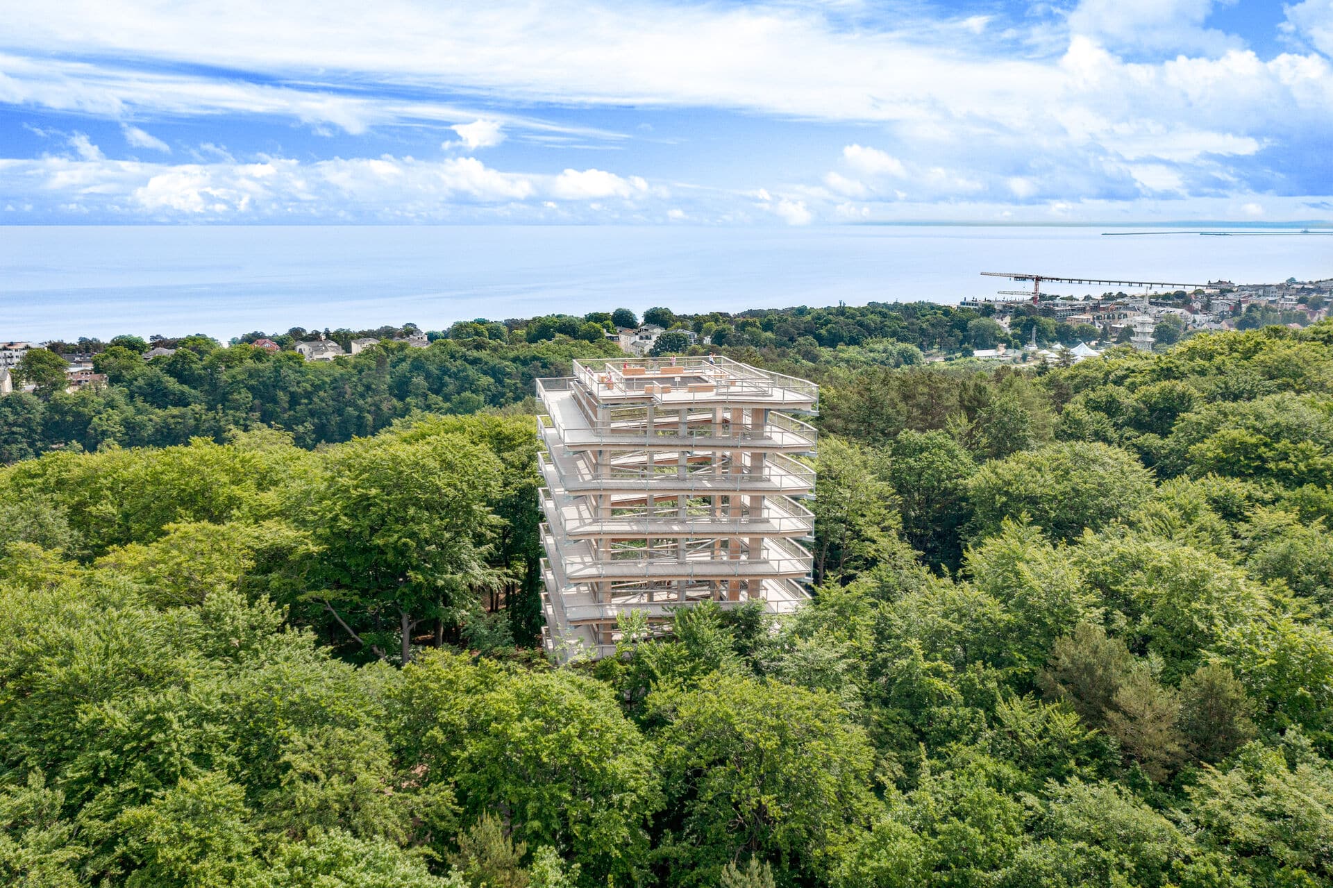 Auf dem Baumwipfelpfad im Naturerbe Zentrum Rügen spaziert man in vier bis 17 Metern über dem Boden des naturnahen Buchenwaldes. Den 1.250 Meter langen Holzsteg säumen abwechslungsreiche Lernstationen, die spielerisch Wissenswertes rund um das Thema Natur vermitteln. Abenteuerlustige können sich mit freiem Blick auf den unter ihnen befindlichen Waldboden über Balancierbalken und Wackelelemente wagen. Der 40 Meter hohe Aussichtsturm ist in seiner Konstruktion einem Adlerhorst nachempfunden und bietet einen schönen Blick über die Baumkronen und die Ostsee.