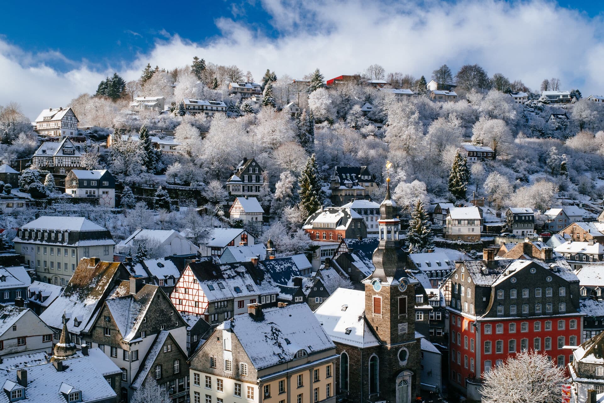 Besonders schön ist ein Besuch in Monschau im Winter, wenn die ersten Schneeflocken fallen und das kleine Fachwerkstädtchen beinahe wie eine Märchenkulisse anmutet. Dann schmücken Weihnachtsbäume die Stadt, in den Cafés und an Glühweinständen gibt es heiße Getränke zum Aufwärmen und es scheint, als verginge die Zeit hier ein bisschen anders.