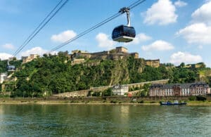 Die Seilbahn erschließt den Besuchern den Kulturfelsen Ehrenbreitstein mit der altehrwürdigen Festung: Mit einer der weltweit modernsten Seilbahnanlagen geht es vom Deutschen Eck/Konrad-Adenauer-Ufer hoch hinauf zum Festungsplateau. Mit ihren Panoramakabinen verspricht die Seilbahn eine unvergessliche Fahrt über den Rhein und gehört sicherlich zu den größten Attraktionen im UNESCO-Welterbe Oberes Mittelrheintal. Man überwindet schwebend 112 Höhenmeter und kann spektakuläre Aussichten genießen.