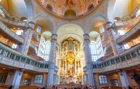 Die wohl prachtvollste Kathedrale der evangelischen Christenheit nördlich der Alpen steht in Dresden: die Frauenkirche. Im 18. Jahrhundert erbaut, 1945 zerstört und fast 50 Jahre als Ruine ein Mahnmal gegen den Krieg, wurde die Kirche nach dem Mauerfall mit Spenden aus der ganzen Welt wieder aufgebaut und ist heute Touristenmagnet und Friedenssymbol gleichermaßen.