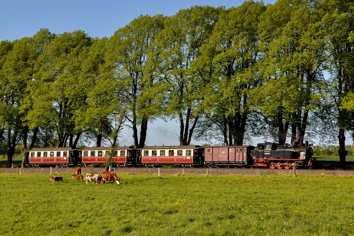 Seit 1886 verrichtet der Molli, wie die Bäderbahn liebevoll von den Einheimischen genannt wird, seinen Dienst und ist seit 1976 ein technisches Denkmal und eine Touristenattraktion zugleich. Auf schmaler Spur geht es zunächst mitten durch die engen Straßen der Münsterstadt Bad Doberan, dann geht es an einer der schönsten Lindenalleen Mecklenburgs entlang und vorbei an der ältesten Galopprennbahn Europas. Vorbei dampft der Zug an der weißen Stadt Heiligendamm und weiter zur Steilküste und nach Kühlungsborn. Die Fahrzeit für die 15,4 km lange Strecke beträgt ca. 55 Minuten – und hier und da kann man sogar einen Blick auf die Ostsee erhaschen. Im gemütlichen Salonwagen kann man während der Fahrt sogar Kaffee und Kuchen genießen.