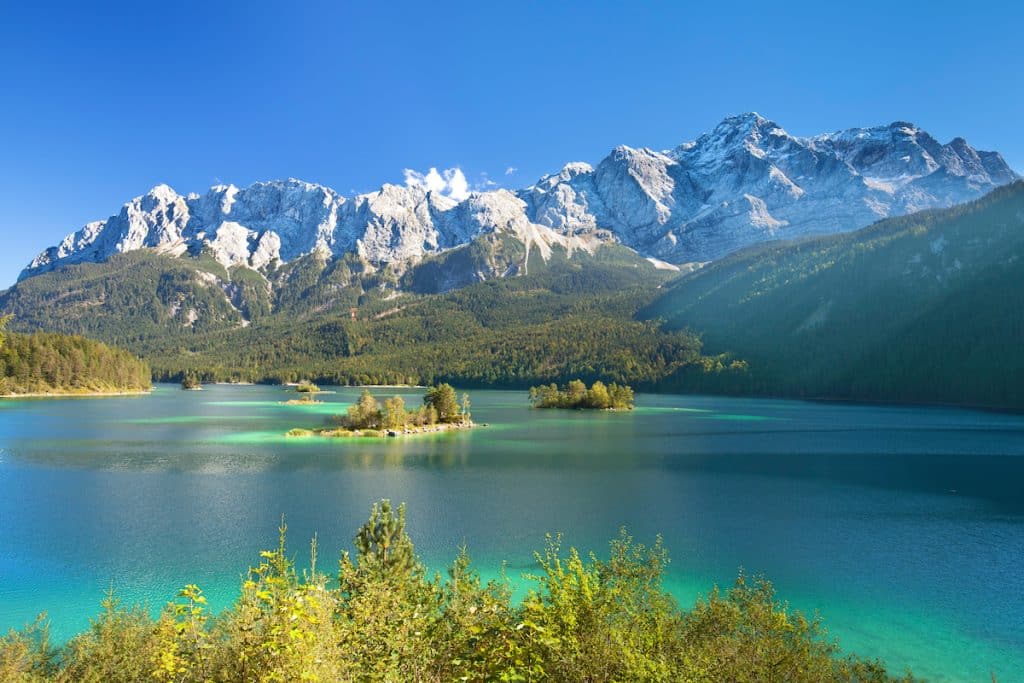 Direkt am Fuße der Zugspitze und unweit von Garmisch-Partenkirchen liegt einer der schönsten Seen der bayerischen Alpen – der Eibsee verzaubert mit seinem kristallklaren, grünlich schimmernden Wasser, begeistert mit seinen Bade- und Wassersportmöglichkeiten im Sommer und hält zudem noch mit dem Eibsee-Rundweg einen der schönsten Spazierwege Bayerns bereit. Wanderer finden hier zahlreiche Wege durch das Naturparadies am Fuße der Zugspitze, die sowohl für Alpinisten als auch für Familien mit Kindern eine ganze Menge zu bieten haben. Wer den Eibsee im Winter besucht, sollte einen Abstecher zur nahen Partnachklamm machen – die erstarrten Wasserfälle und riesigen Eiszapfen sind ein echtes Erlebnis.