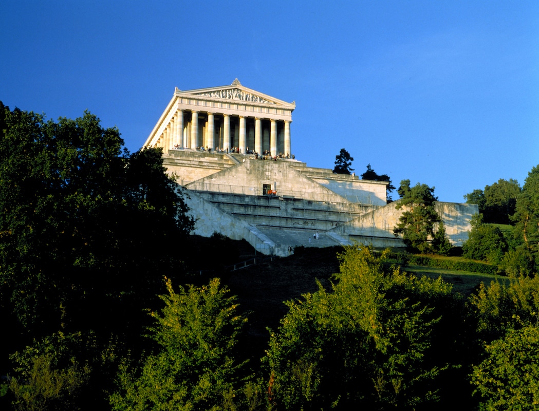 Walhalla: Nahe Regensburg erhebt sich der eindrucksvolle Bau der Walhalla über die Donau. Mit diesem klassizistischen Bau in Gestalt eines von Säulen umgebenen Tempels entstand im Auftrag des bayerischen Königs Ludwigs I. eines der bedeutendsten deutschen Nationaldenkmäler des 19. Jahrhunderts. Im Inneren sind entlang der Wände die Büsten und Gedenktafeln verdienter deutschsprachiger Männer und Frauen zu sehen, darunter Albrecht Dürer, Johannes Kepler, Friedrich von Schiller und Johann Wolfang von Goethe.