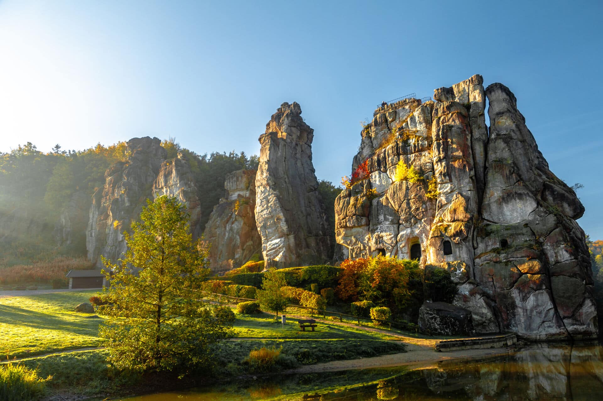 Mystisch und zauberhaft zeigt sich der Teutoburger Wald im Herbst, den man am besten auf dem Hermannsweg erwandert. Benannt ist der Weg nach Hermann dem Cherusker, der in dieser Region im Jahre 9 n. Chr. den römischen Feldherrn Varus besiegt haben soll. Im Herbst leuchten die Laubwälder in bunten Farben, und die Stimmung an den mystischen Externsteinen ist jetzt besonders schön, wenn sich die bunten Bäume im Wasser spiegeln.