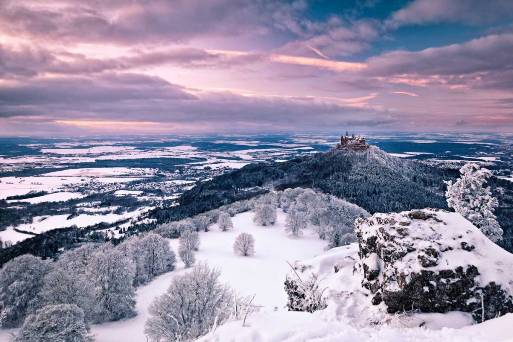 Premium-Wanderweg mit Fernblicken, verschneiten Wacholderheiden und Blick auf die Burg Hohenzollern