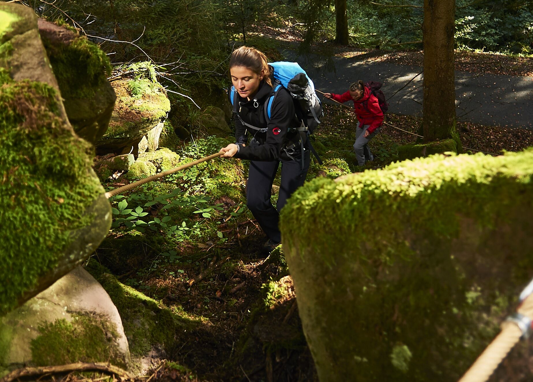 1. Etappe: Bahnhof Bad Herrenalb – Erlebniscampingplatz Albtal Arena Bad Herrenalb (24 km): Auf der ersten Etappe geht es durchs Gaistal und zur Teufelsmühle. Vom Bahnhof Bad Herrenalb geht es hinein in den Wald, zu Beginn noch über breite und befestigte Fahrwege bergauf. Danach geht es direkt in einen Steilhang, der mächtig bergauf führt. Das Gelände ist unwegsam, immer wieder versperren querliegende Bäume den Weg. Oben am Sattel angekommen geht es auf der anderen Seite über wunderschöne Waldwege und Trails wieder bergab in Richtung Gaistal. Die Route führt querfeldein durch Laubwald und steigt anschließend über Trails und teils zugewachsene Graswege im Talschluss des Gaistals wieder steil an. Hier folgt der steilste Teil der Strecke, der im felsdurchsetzten Gelände mit Hilfe von Tauen überwunden werden muss. Über den Schweizerkopf mit schöner Aussicht geht es steil und sportlich bergab in Richtung Albquelle, anschließend über einsame und weltverlorene Graswege wieder hinauf in Richtung des nächsten schönen Aussichtspunkts an der Teufelsmühle. Spektakuläre Sandsteinhöhlen, die sogenannten Teufelskammern, warten auf dem letzten Teilstück der Etappe, bevor es gemütlich zum Etappenziel geht.