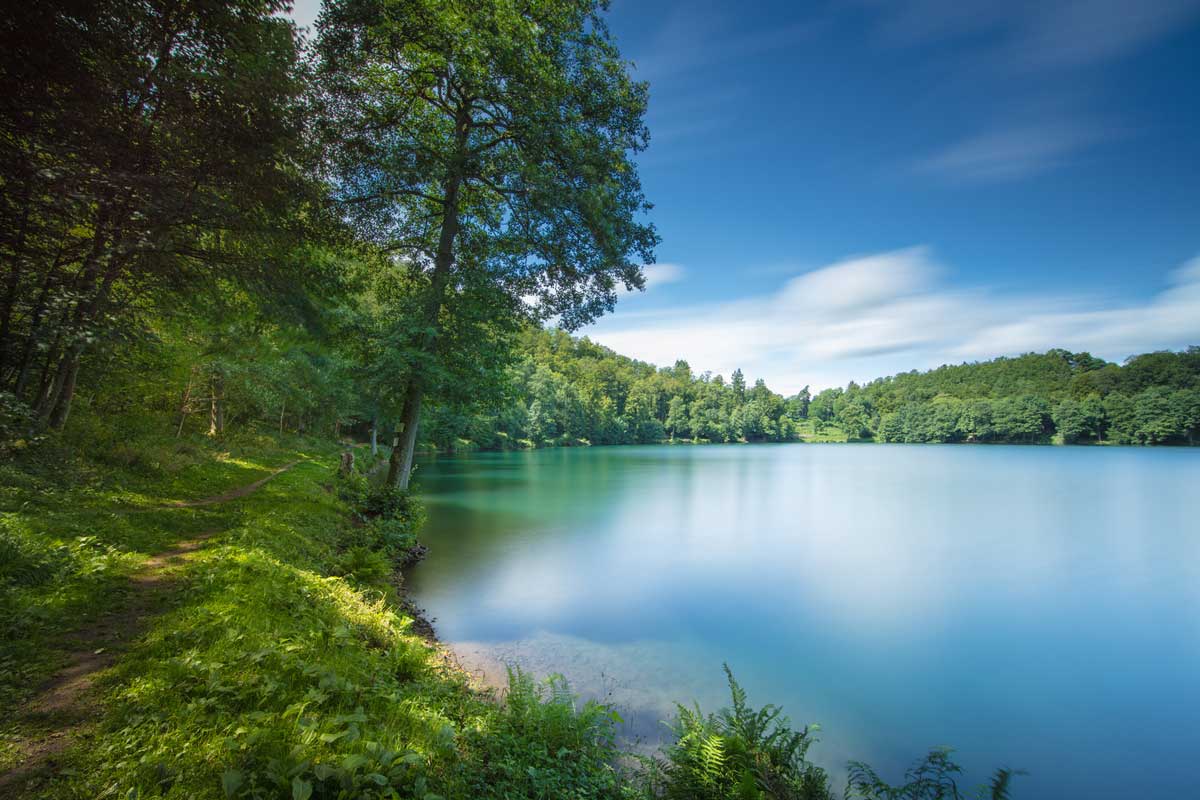 2. Etappe: Daun – Manderscheid (17 km): Zwei Highlights warten auf der zweiten Etappe des Lieserpfads. Gleich zu Beginn erwandert man das Gemündener Maar, umgeben von hohen Bäumen. Still und einsam verläuft der Wanderweg durch das Tal der Lieser, durch grünen Wiesengrund und später durch lichte Eichenhaine. Am Ende der Etappe wartet der Felsenpfad oberhalb des Flusses und den Burgen von Manderscheid.