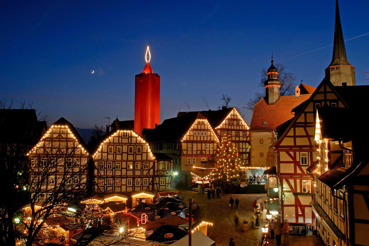 Außergewöhnlich geht es auch in der Burgenstadt Schlitz in der Adventszeit zu, denn hier gibt es mit 42 Metern Höhe die größte Kerze der Welt zu sehen. Es handelt sich hierbei aber nicht um eine Kerze aus Wachs, sondern um den alten Wehrturm, der Bestandteil des Burgensembles der alten Fachwerkstadt ist und der in der Weihnachtszeit einfach ein Kleid aus rotem Tuch erhält. Auf der Spitze des Turmes, der bequem mit dem Fahrstuhl erklommen werden kann, thront eine mit elektrischen Glühbirnen versehene Nachbildung der Kerzenflamme. Die Besucher in Schlitz erwarten ein umfangreiches Programm, Live-Musik, Verkaufsausstellungen, Kinderkarussell und natürlich leckeren Glühwein. Der Weihnachtsmarkt Schlitz ist geöffnet an allen vier Adventswochenenden, Sa + So 12.00 – 20.00 Uhr. www.schlitz.de