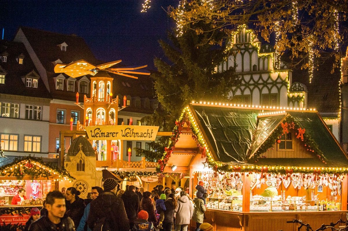 Traditionell und festlich zeigt sich der Weihnachtsmarkt in der Kulturstadt Weimar. Vom Theaterplatz bis zum Markt locken viele kleine Marktstände mit typischen Advents- und Weihnachtsangeboten: Lauschaer Glaskunst, erzgebirgische Schnitzereien und die vielen kulinarischen Angebote aus Thüringen lassen schnell Weihnachtsstimmung aufkommen. Der festlich beleuchtete Weihnachtsbaum wurde bereits 1815 erstmals aufgestellt. Der Weimarer Weihnachtsmarkt hat geöffnet vom 25.11.2025 bis 04.01.2026, So-Do 11.00 bis 22.00 Uhr, Fr+Sa 11.00 bis 23.00 Uhr. Am 24./25. Dezember 2025 und 1. Januar 2026 bleibt der Markt geschlossen. www.weimar-weihnachtsmarkt.de