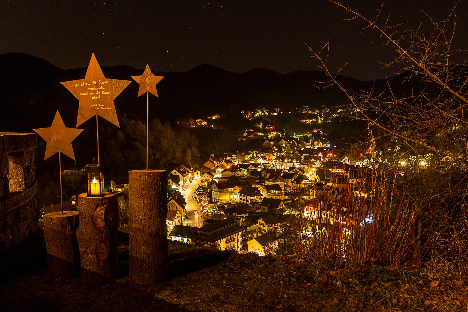 Besonders strahlend geht es in Bühlertal zu: Mehr als 1000 vom Ober- bis ins Untertal aufgehängte Sterne lassen Bühlertal vom 1. Adventswochenende bis zum 6. Januar 2026 erstrahlen. Am 29.11. ab 16:00 Uhr und am 30.11. ab 11:00 Uhr findet im Haus des Gastes ein Adventsmarkt statt, parallel dazu auf dem Brunnenplatz davor ein „Adventszauber“ mit Bewirtung und musikalischer Unterhaltung. Wer gerne durch Winterlandschaften wandert, der sollte den Sternenweg nicht verpassen: Dieser startet an der Touristeninformation und bietet zahlreiche „Sternenstationen“ sowie Kunstwerke aus Holz oder aus Scherenschnitten, die zum Innehalten einladen. www.buehl-buehlertal-ottersweier.de