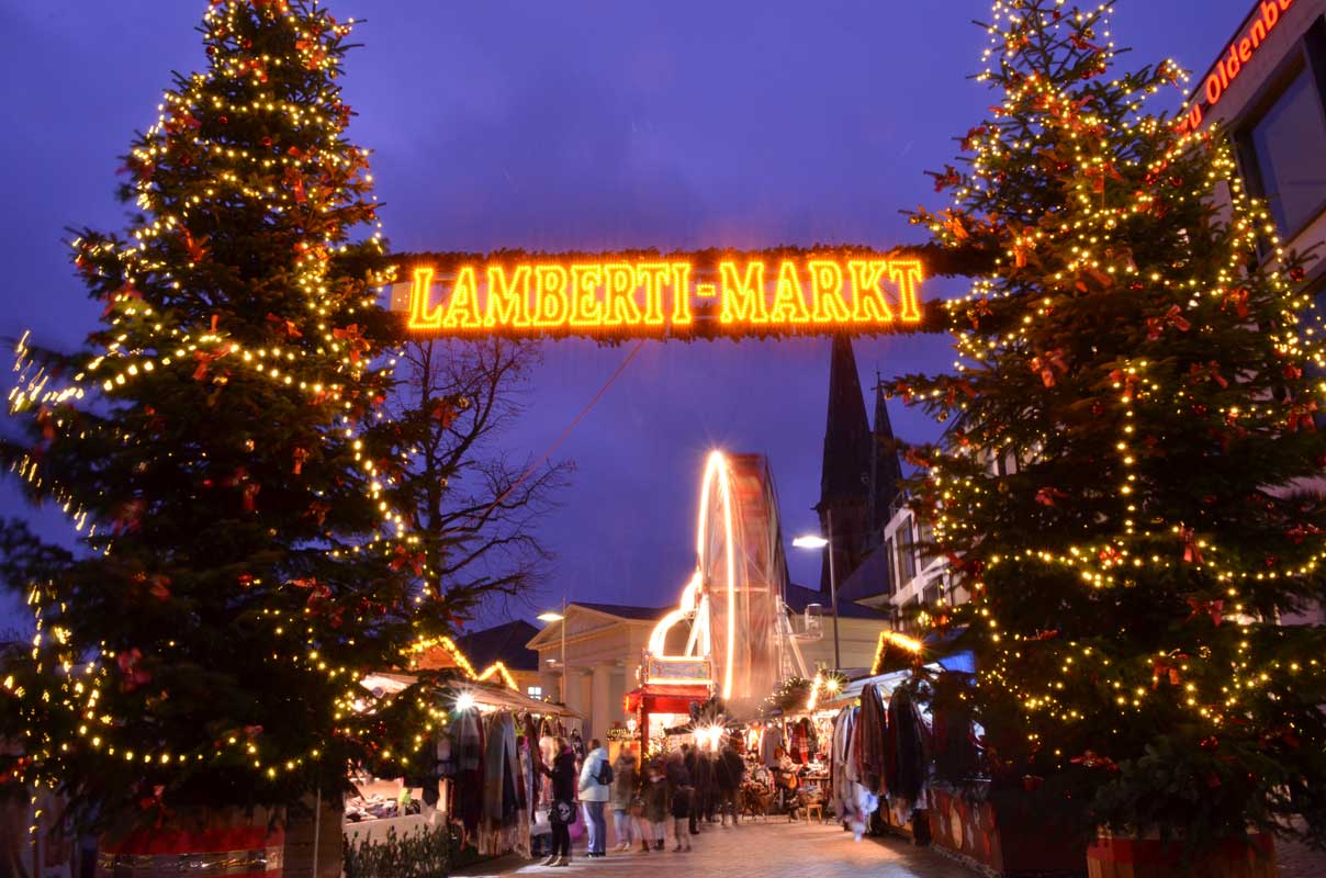 Zwischen dem Alten Rathaus, der backsteinernen St. Lamberti-Kirche und dem historischen Schloss verbreitet der Lamberti-Markt in Oldenburg eine besondere vorweihnachtliche Atmosphäre. Seinen Namen erhielt der Markt nach St. Lambertus, Bischof von Maastricht, nach dem auch die benachbarte evangelische Hauptkirche St. Lamberti benannt ist. In seiner heutigen Form wurde der Markt erstmals 1972 auf dem Rathausmarkt abgehalten. Aus einem eher bescheidenen Weihnachtsbasar und Tannenbaumhandel entwickelte er sich zu einem der führenden Weihnachtsmärkte im norddeutschen Raum.