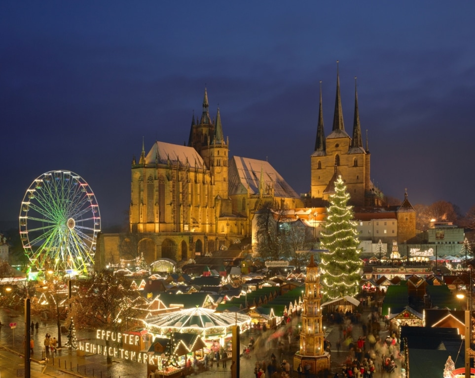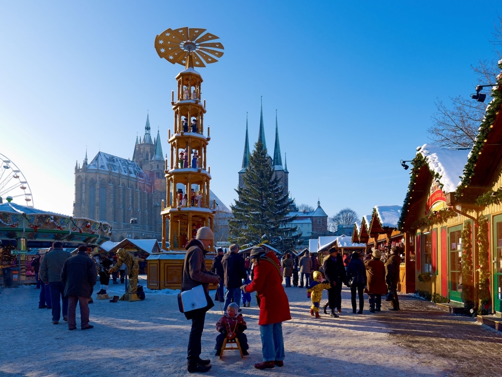 Die Landeshauptstadt Thüringens schmückt sich festlich im Advent. Geprägt durch einen der am besten erhaltenen mittelalterlichen Stadtkerne Deutschlands ist die Stadt eine reizvolle Mischung aus reichen Patrizierhäusern und liebevoll rekonstruierten Fachwerkhäusern. Mariendom und Severikirche, das monumentale, unverwechselbare Bauensemble und zugleich Wahrzeichen Erfurts, ist in warmes Licht getaucht. Weihnachtsmelodien erklingen und der Duft von Glühwein und Pfefferkuchen liegt in der Luft. Diese einzigartige Altstadt ist die ideale Kulisse für eine stimmungsvolle Vorweihnachtszeit. Der Erfurter Weihnachtsmarkt 2025 wird am 25. November 2025 eröffnet.