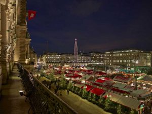 Vor der ehrwürdigen Kulisse des Rathauses bieten jedes Jahr rund 80 Händler, Schausteller, Kunsthandwerker und Marktkaufleute aus ganz Deutschland ihre Waren feil. Dabei steht der Markt unter dem Motto: Kunst statt Kommerz. Auf dem Hamburger Weihnachtsmarkt kann man sich auf eine Reise in die Vergangenheit begeben, denn hier ist alles so, wie es einmal war: Nürnberger Lebkuchen statt Popcorn, edles Kunsthandwerk statt Handyschalen, ausgefallene Geschenkideen statt Tennissocken und eine Marktarchitektur mit urigen Gassen lassen nicht nur Kinderherzen höher schlagen. Der Duft von gebrannten Mandeln, Lebkuchen und Nüssen wabert über den Markt, ebenso wie das Aroma des beliebten, extra für den Hamburger Weihnachtsmarkt entwickelten Glühweins. Doch nicht nur das macht den Historischen Weihnachtsmarkt in Hamburg einzigartig: zum Schauen und Staunen laden auch die aufwendig dekorierten und extra für Hamburg gebauten Marktstände, die mit Engeln und goldenen Äpfeln geschmückten Weihnachtsbäume, die lichtdurchwirkten Tannengirlanden, das einheitliche Design der Glühweintassen, das schmiedeeiserne Eingangstor oder ein Kinderkarussell aus den Goldenen 20er Jahren und Verkaufswagen aus der Kaiserzeit ein. Nicht nur für Kinder ein besonderes Erlebnis: dreimal täglich fliegt der Weihnachtsmann mit seinem von Rentieren gezogenen Schlitten über den Markt.