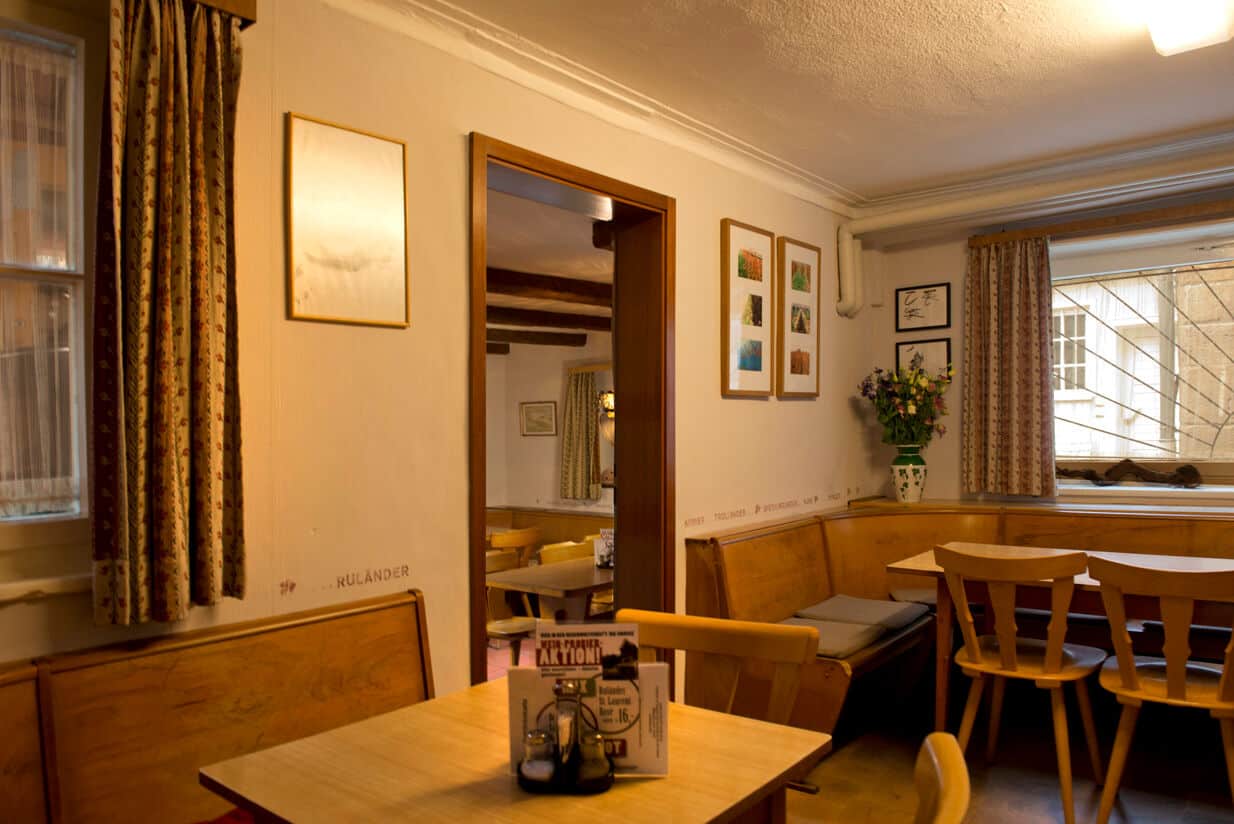 Gemütlich geht es zu in Ulmers Besenwirtschaft in Stuttgart-Zuffenhausen, denn die Räumlichkeiten erwecken den Eindruck, sich mitten im Wohnzimmer der Gastgeber zu befinden. Man kümmert sich herzlich um die Gäste, ausgeschenkt werden die eigenen Weine direkt aus der Karaffe und probieren sollte man auf jeden Fall die selbstgemachten Maultaschen mit Trollingersoße.