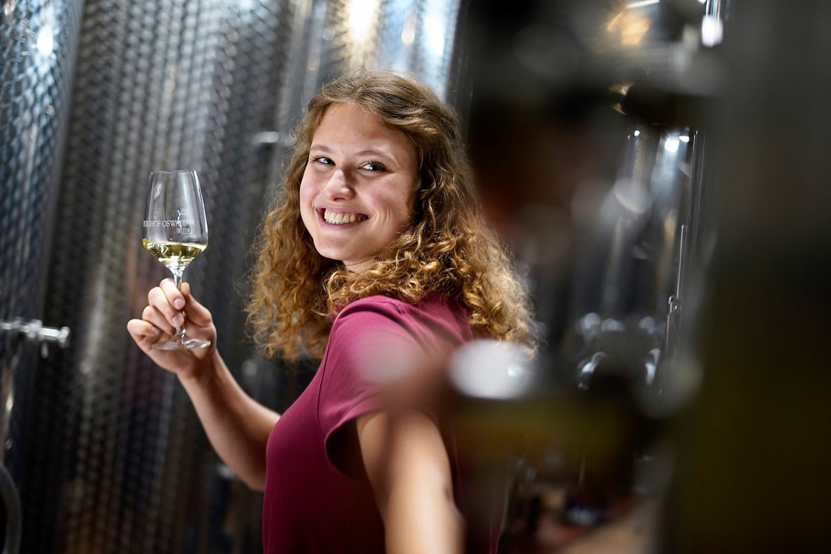 Julia Oswald (Jahrgang 1996) schloss ihr Studium an der Hochschule Geisenheim im Jahr 2020 mit dem Bachelor of Science ab und begann direkt im Anschluss mit dem Masterstudiengang Weinwirtschaft an der Justus-Liebig-Universität Gießen. Auslandsaufenthalte während des Studiums führten die engagierte Jungwinzerin nach Dänemark an die University of Copenhagen und nach Kanada zur Poplar Grove Winery. Zuhause im elterlichen Weingut ist sie seit 2016 als Winemaker tätig.