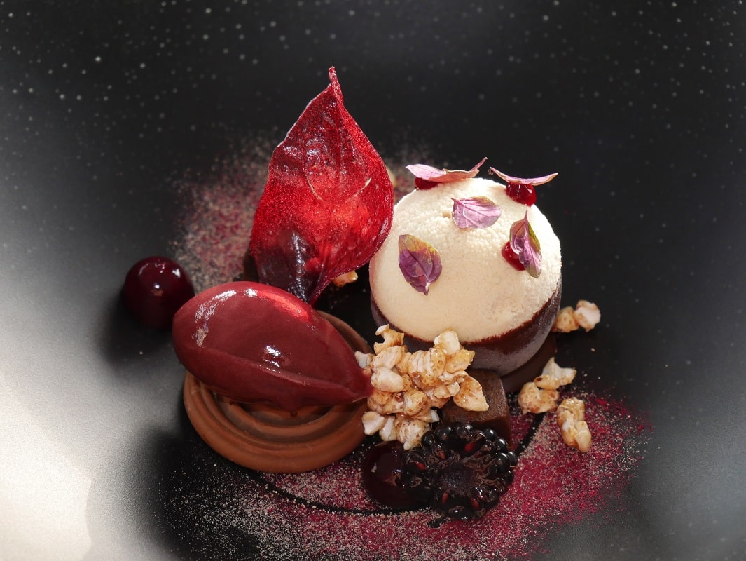2. Für das Milcheis Milch mit Sahne, Glucose und Zucker aufkochen, dann das Eigelb einmixen. Für die Buttercreme Milch mit Honig und Puddingpulver kochen. Weiche Butter aufschlagen, anschließend mit dem kalten Pudding und einer Prise Salz verrühren.
