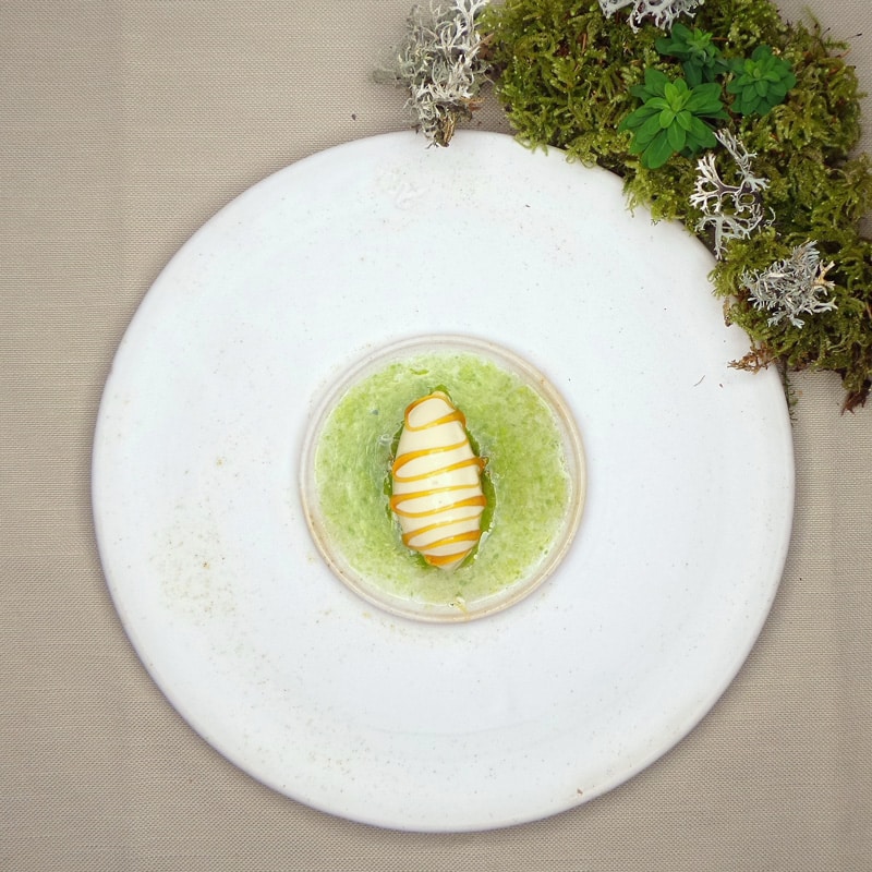 6. Für den marinierten grünen Apfel den Granny Smith auf Stufe 1.5 an der Aufschnittmaschine aufschneiden und mit einem Ring ausstechen. Danach in der Marinade für ca. 30 Min. marinieren. Reisessig, Mirin, Sojasauce und Knoblauch aufkochen. Die Kräuter dazugeben und für 30 Min. ziehen lassen. Den abgekühlten Fond abpassieren und das Sonnenblumenöl unterrühren.