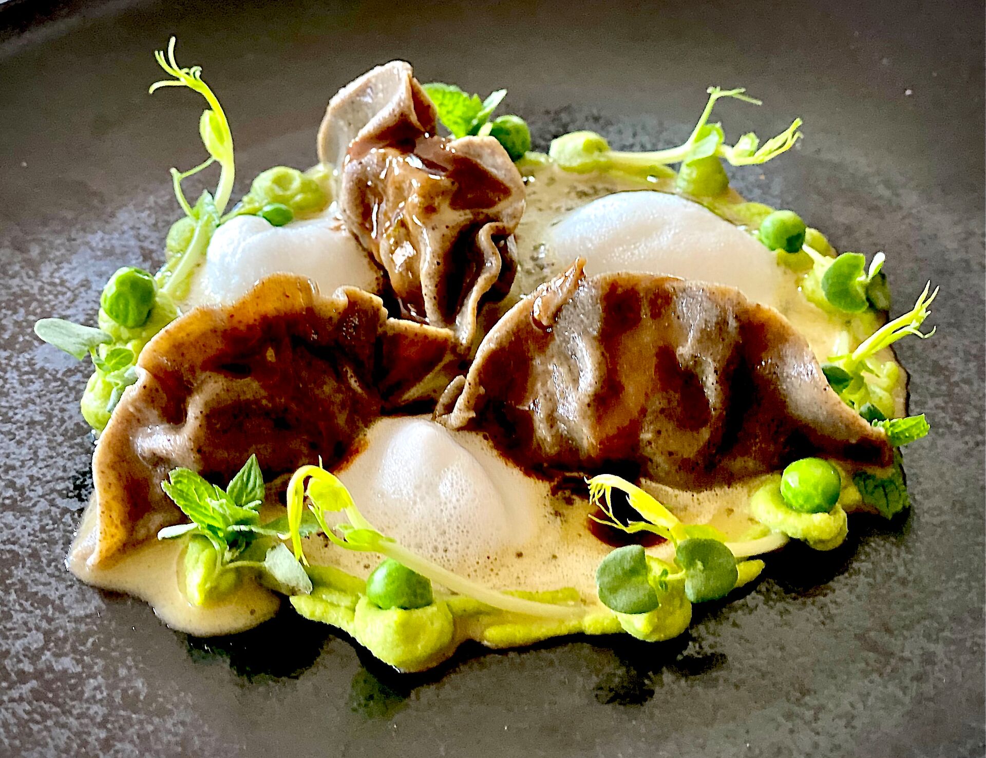 9. Anrichten: Den marinierten Taschenkrebssalat mit Hilfe eines Ringes direkt auf dem Teller anrichten. Den marinierten Wassermelonenrettich und die Apfelscheiben abwechselnd auf dem Taschenkrebssalat anrichten. Danach die restliche Taschenkrebsmayonnaise in mehreren Punkten auf einer Linie über den Taschenkrebssalat spritzen. Die marinierten Rettichscheiben einschneiden und zu Zylindern formen, die Zylinder darauf platzieren. Die marinierten Apfelschleifen zu Rollen drehen und dazwischen anrichten, danach zwischen die Rettichzylinder und die Apfelröllchen die Sepiabriochechips stecken. Alles mit Mikrokresse dekorieren. Die Buttermilchvinaigrette sowie die Apfelvinaigrette mit Koreanderöl abschmecken. Beide Vinaigrettes um den Taschenkrebssalat verteilen.