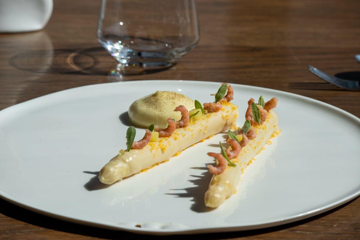 4. Für die Yuzu Beurre Blanc: Nehmen Sie 100 g vom Spargelfond, pressen Sie eine Zitrone hinein und fügen 1 g Xanthan hinzu. Aufkochen und mixen. 100 g geschnittene Butter nach und nach hinzufügen. Parfumieren Sie die fertige Beurre Blanc mit Yuzu nach Geschmack.