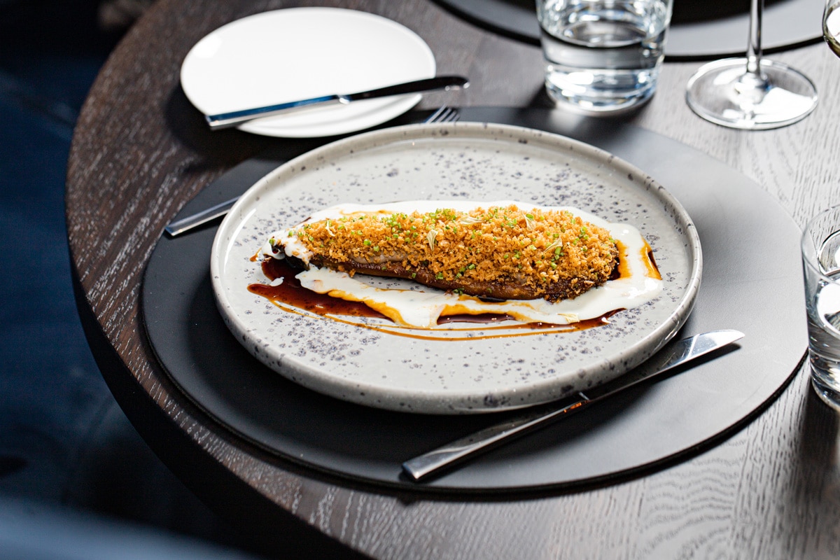 5. Die Aubergine mit der Schnittseite nach oben auf einen Teller geben, das Shiitake-Püree reichlich darauf verstreichen und mit knusprigem Panko belegen. Kornblüten und gehackten Korianderstiel arrangieren. Die verbliebene Marinade aus der Pfanne um die Aubergine gießen. Mit Seidentofu-Creme nappieren.
