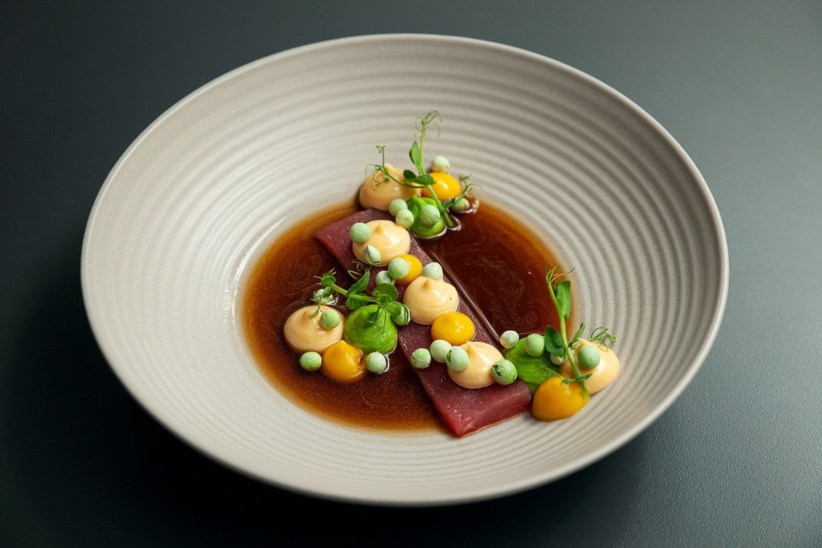 5. Den Thunfisch in höchster Qualität roh in einen Riegel schneiden. Den Fisch in der Tellermitte platzieren und mit dem Gel sowie den beiden Cremes anrichten. Um das Gericht mit allen Aromen auszustatten, immer alle 3 Tupfer zusammen an einem Fleck anrichten. Nun noch etwas Hopfen auf den Fisch geben und den lauwarmen Sud angießen. Falls vorhanden, gerne noch Erbsensprossen mitdekorieren.