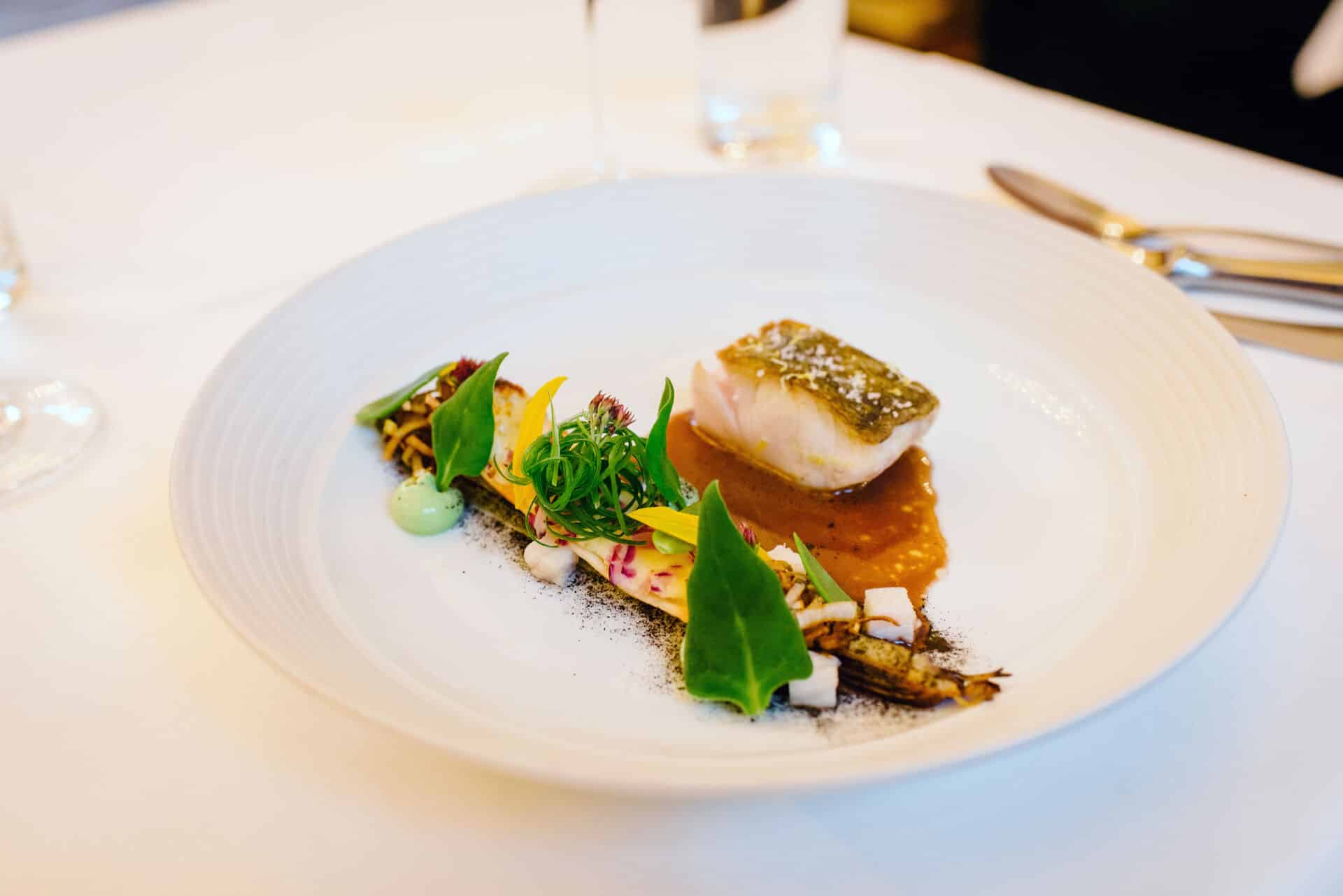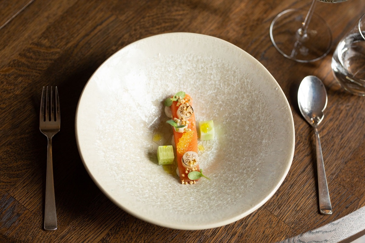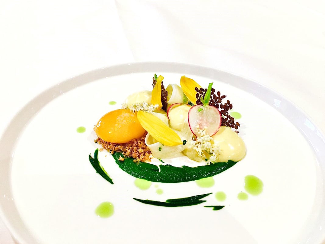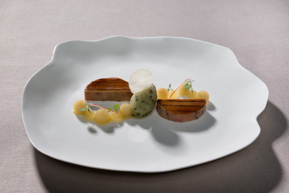 1. Gänseleber enthäuten und Sehnen entfernen, anschließend mit den restlichen Komponenten marinieren und 24 Std. im Kühlschrank ziehen lassen. Die marinierte Masse in Folie einrollen und bei 60 Grad Dampf für 15 Minuten in den Kombidämpfer schieben (als Alternative: Vakuumieren und im Wasserbad für 10 Minuten ziehen lassen). Die Gänseleber anschließend auskühlen lassen und in 0,5 cm dicke Streifen schneiden. Die Scheiben mit einer Kuvertüre- Kakaobuttermischung (Verhältnis 1/2) einpinseln und nach Belieben schichten.
