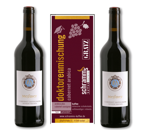 - Zu zwei Flaschen des wunderbar gereiften 2015er Cabernet Sauvignon trocken (VDP Gutswein) gibt es noch eine 250-Gramm-Packung Doktorenmischung der Kaffeerösterei Schramms. Die Arabica Sorte Yellow Bourbon von der Farm Sao Silvestre hat ausgeprägte Noten von Schokolade und Vanille. Die Kaffeebohnen durften einige Zeit im Cabernet Sauvignon lagern und wurden dann getrocknet und geröstet.