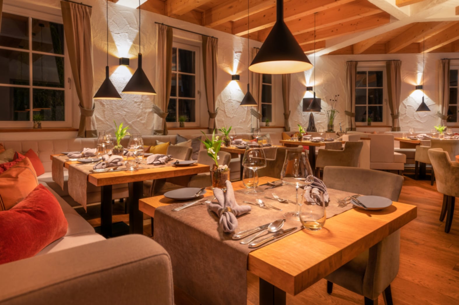 Viel Holz, offenes Fachwerk und ein Kamin sorgen im Restaurant für eine behagliche Atmosphäre. Hier serviert man exquisite und erlesene Gerichte wie „Sanft gegarter Saibling aus dem Eyachtal mit zweierlei vom Blumenkohl und Sudachi-Hollandaise“. Das Braustüble im ehem. Kuhstall und der lauschige Biergarten bieten ebenfalls einen gemütlichen Platz für die Gäste. Hier werden neben hochwertiger Hausmannskost natürlich auch die Erzeugnisse der Hausbrauerei aufgetischt.