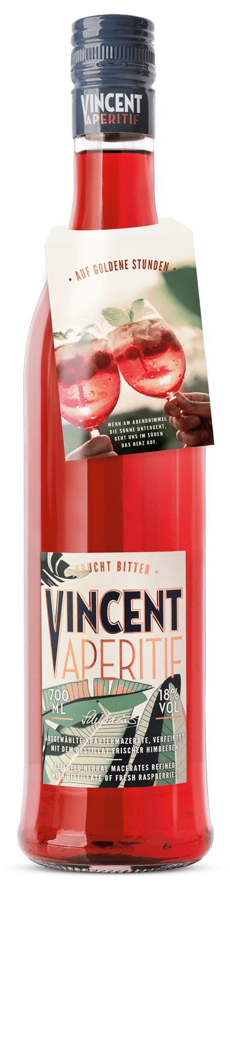 Der bittersüße Geschmack ausgewählter Kräuter und frischer Himbeeren bringt das Lebensgefühl des Südens ins Glas – egal, wo wir gerade sind. Authentisch handgemacht im Süden Deutschlands bietet Vincent eine regionale, familiäre Alternative für alle Aperitif-Genießer. Die ausgewählten, natürlichen Kräutermazerate und das hochwertige Destillat frischer Himbeeren kommen komplett aus eigenem Haus. Besonders lecker schmeckt der Frucht-Bitter als Vincent Tonic oder Vincent Spritz.