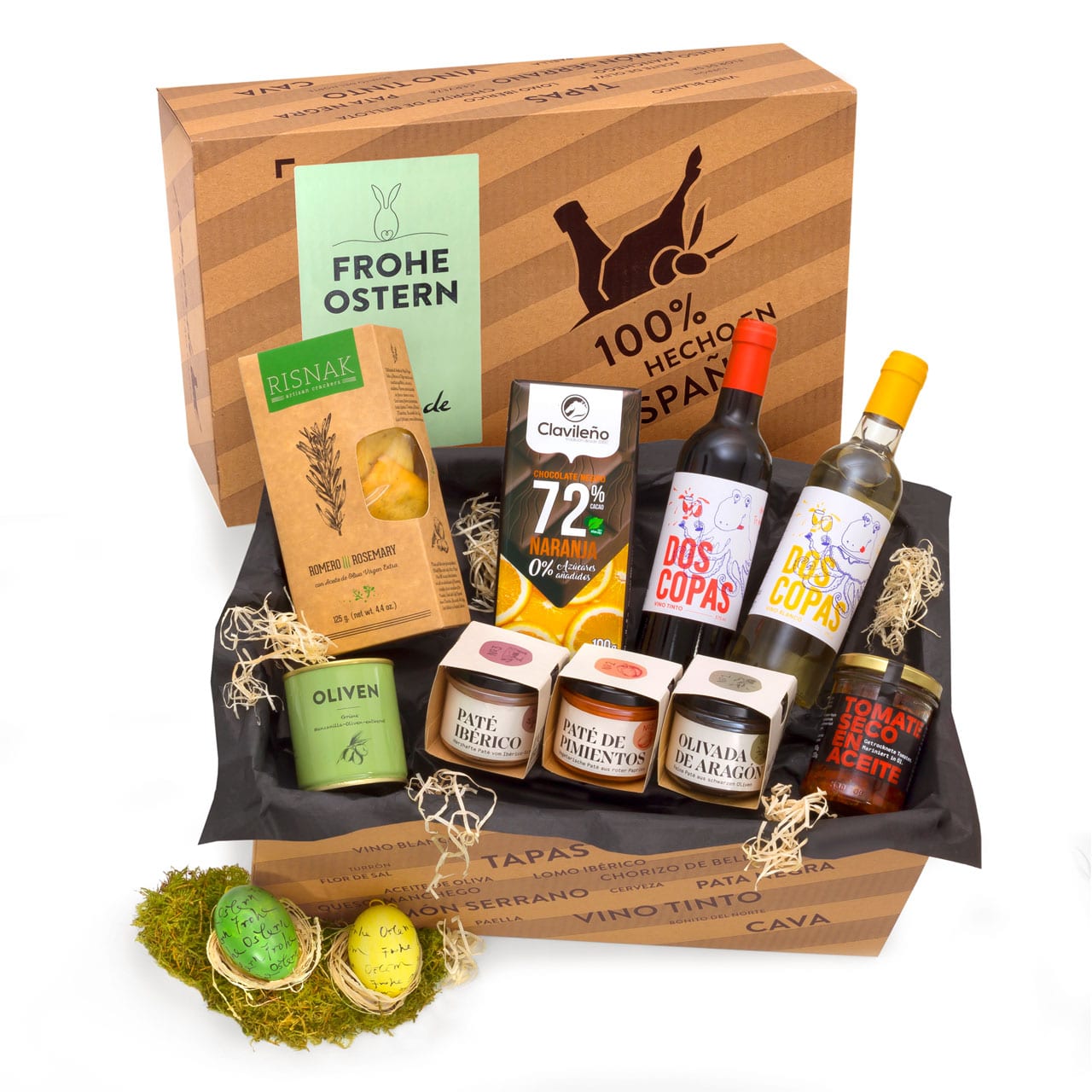 Die Geschenkbox enthält eine exklusive Auswahl kalter Tapas als Osterpräsent und kulinarisches Frühlingserwachen. Genießen Sie feine Patés, Oliven, getrocknete Tomaten, Rosmarincracker und Orangenschokolade bei einem schönen Glas Weißwein oder Rotwein.