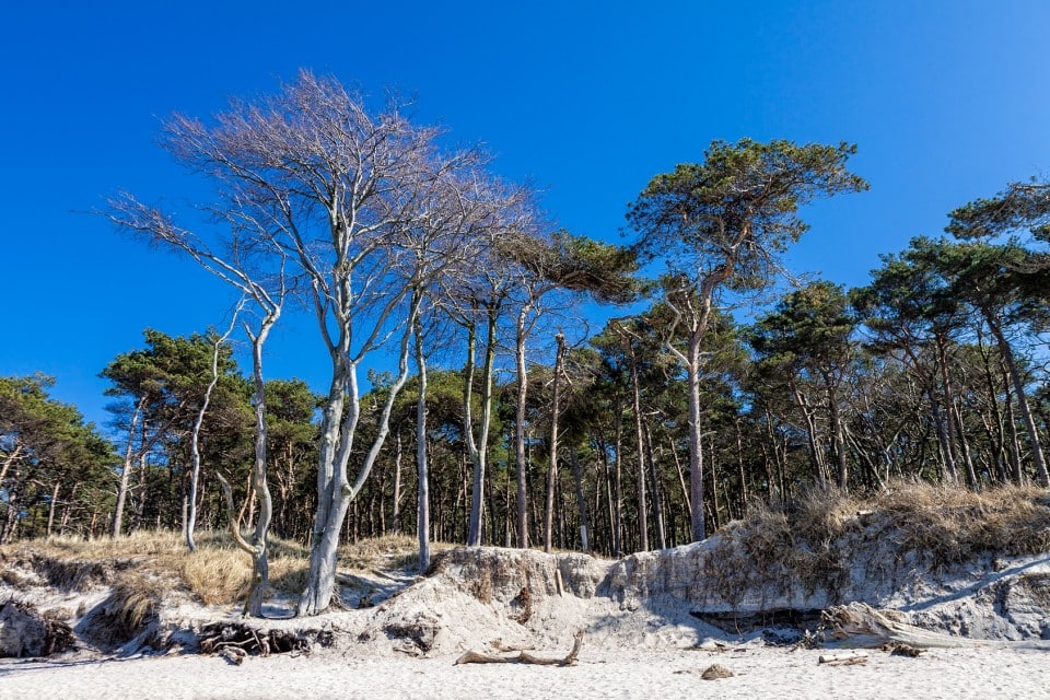 Der Weststrand am Darß mit seinem Darßwald wird durch einen urwüchsigen Naturstrand begrenzt und ist bekannt für seine Windflüchter, die ihren Wuchs an die vorherrschenden Winde angepasst haben. Auf Rügen findet sich der sehenswerte Küstenwald Goor, der durch einen schönen Rundweg erschlossen wird, und auf der Nordspitze Hiddensees erhebt sich die Hügelkette Dornbusch mit ihren Kiefern, die einen herrlichen Blick aufs Meer ermöglicht. Usedom besticht durch seine Sandstrände mit Steilküsten und Binnenseen, und auf Rügen sind zudem die Feuersteinfelder sowie die großen Findlinge sehenswert, die vor der Küste aus dem Meer ragen. Weltbekannt auf der Insel Rügen ist zudem das Kap Arkona mit den Kreidefelsen an der Nordspitze – zwei Treppen führen an den steinigen Strand zu Füßen der Klippen.